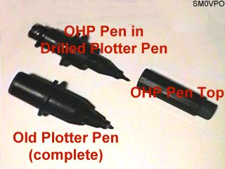 This article is about another method I tried and had 100% success first time. The object is to modify an old plotter pen so that you can draw direct onto the PCB material itself. No photography, just a new pen. All you have to do is the use one of those Faber Castell S overhead marker pens and it works just as well as a Dalo PCB drawing pen, but a lot cheaper. Unfortunately these pens are far too long to stuff into the plotter, you need a little modification. You also need to use an A4 sized bit of film to hold the PCB. I just taped the PCB in the centre and told the plotter program to centre the plot. Easy!