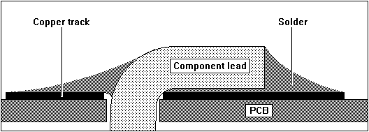 When making a soldered joint the object is to get the solder to flow over the component lead and the copper track of the PCB. Excessive solder looks unsightly and can hide bad joints. Excessive solder may also form a bridge between adjacent copper pads on the PCB resulting in "short-circuits". The correct amount of solder is used when you can see an impression of the component lead in the solder, yet the solder has flowed over the complete component lead and the PCB pad. The joint should have a smooth mirror-like surface without spikes or mounds.