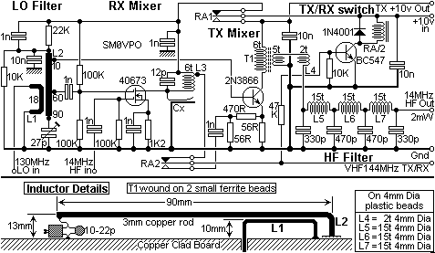 The TX mixer is an ordinary bipolar transistor. This is because there are RF signal levels of well over 10mW coarsing through this stage, so a small VHF power transistor gives far better linearity. The HF output from this stage is via T1; a small transformer wound on two VHF ferrite beads. Grade and size is unimportant. If the wire fits, use it!