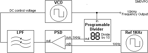 Here the output of the VCO is divided by 10 before feeding it into the PSD. This means that the loop will see an error and push the VCO frequency up until it has 1KHz at both the PSD inputs. This will only occur if the frequency before the divider is 10 times greater than the reference frequency. If you change the divide rate to 9 then the loop will only achieve a lock condition if the VCO delivers 9KHz. In other words, the divide rate multiplied by the reference frequency is equal to the VCO output frequency. If the divide rate were set to 1500 then the VCO frequency would have to be 1.5MHz. Note also that the output frequency will only vary in steps equal to the reference frequency.
