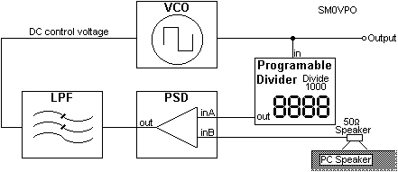 Yes, this is quite easy, at a simple level. As already stated, you can control the VCO frequency by adjusting the divide rate. The reference frequency multiplied by your divide rate is the output frequency. Ok then, so what happens if you vary the reference frequency? The VCO (synthesiser output) frequency will also vary. This opens up new possibilities. So let us program the divider for 1000, but instead of a crystal based reference oscillator, let us connect the CD4046 PSD signal input to a 50-ohm speaker used as a microphone, via a blocking capacitor. Place the speaker/microphone over the speaker in your computer.