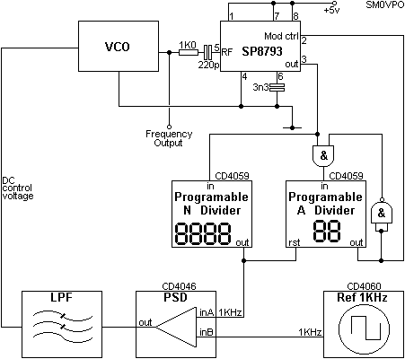 In our synthesizer above, with the added SP8793, there are four pins all connected to the +ve 5V supply. Pin 2 is connected to set the prescaler to a divide rate of 40. If pin 2 is grounded the the SP8793 will divide by 41. In other words, the SP8793 is already a dual modulus counter, but we have not yet used it as such. Let us look at a few numbers, but we will still use our same synthesizer model with the 1KHz reference oscillator and SP8793 prescaler.