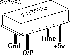 I am going to begin with a 26MHz TTL crystal square-wave oscillator. This could be either a TTL chip or a crystal module. I prefer the crystal module since these have a small frequency adjustment by voltage, and they do not require any assembly, just a little superglue so they have their legs in the air to form suitable anchoring points for other components.