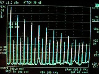 Here you can see the two alternatives, either a TTL circuit or a ready-made module. For the higher crystal frequencies you will need to be certain that the crystal is not a harmonic crystal, as this oscillator will only function at the fundamental frequency of the crystal, but it is just a suggestion. The 26MHz module is available from a variety of sources, such as QuartzLab, see my suppliers and links section. The oscillator modules also have a FM input that will shift the carrier a few KHz, which, at the 5th harmonic, gives us some 300KHz of deviation (looks like an ideal start for a WBFM transmitter!!). The left picture below shows the high harmonic content of these oscillators when viewed on a spectrum analyser.