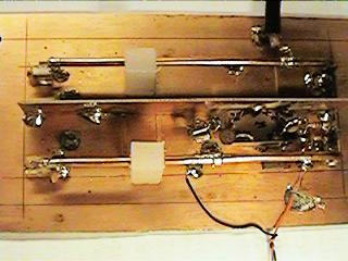 The secret of all this filtering is the use of copper rods and the preset capacitors that tune them. This makes the coil easy to wind, you just need zero turns for any band you like! Two copper rods are bent over at the ends so they can be soldered directly to unetched copper-clad board, see the right-hand photograph above. They could be soldered to pads if you want to raise the voltage, for example, adding a DC bias for transistors, etc. The two rods, in the above example, are 90mm long, mounted horisontally 12mm from the board. For 130MHz they are tuned with about 20pf (15pf + 2-10pf trimmer), but a smaller capacitor will bring them into the 144MHz (2-metre) band.