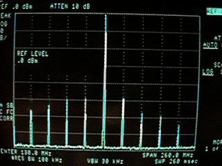 Now we will blast this RF into a small-signal transistor to get a few milliwatts of power out of it. At this stage we are not too bothered about harmonics, in fact we want them. The more power we have, then the more we can have out at the frequency we are interested in. This is then followed by a very narrow band-pass filter. The output should be about 1mW at the 5th harmonic although it is about the same region for all harmonics, up to about the 10th. Here is what the final output looks like. It is then followed by a single transistor amplifer having about 10dB to 12dB of gain, raising the final level to +10dBm. This is sufficient to drive most VHF amplifers to get a few watts out, or to mix with TX and RX signal to convert to other frequencies.