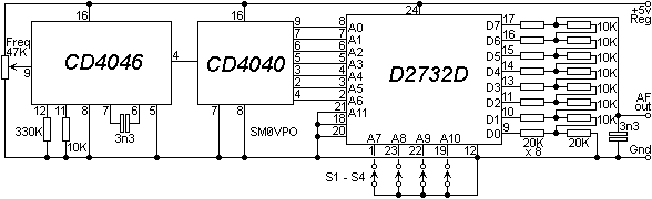 In the circuit diagram I have shown four switches, S1 to S4. These select the 16 blocks of 128 bytes in the EPROM. These blocks can be programmed with different values so that the EPROM can be programmed with 16 different waveforms.