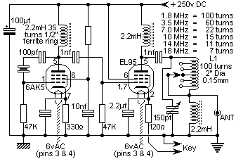 The RF choke in the anode of the two valves is made up of 34 turns of enamelled wire wound on a 1/2" ferrite ring (2.2mH). The output tank circuit is wound on a piece of 2" dia plastic conduit tube. The object is to have as many turns of wire in circuit as it is possible to have on the band of interest. The output tuning capacitor should normally be set to about 10% when selecting the tapping for any particular band.