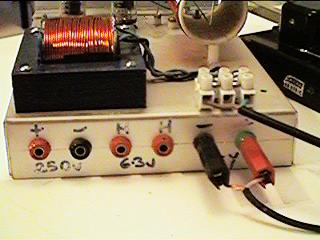 The chassis is built using aluminium plate, drilled as shown above. An extra hole must be added to pass the connection from the PA anode to the tuning coil. If this connection is made using the output coupling capacitor under the chassis then there will be no high DC voltages above the chassis. The mains input terminals must be suitably protected to prevent contact with the mains input. Here is the rear panel of the transmitter. I also mounted sockets for connection to the PSU so that the finished transmitter is also a high voltage PSU for other projects.