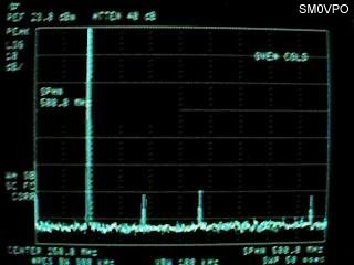 I think that here I should give a little information about the actual measured values of the prototype. The target was to achiece a clean 100mW of output power at 9v. I also indended the transmitter to be equally stable at 13.8v DC since this is what most constructors seem to want. The target was exceeded on all counts. There are no spurious outputs visible from 500MHz upwards, so this spectrum analyser view is only from DC to 500MHz. It shows that there is a little 2nd and 3rd harmonic outputs, but the levels are so low that they are quite negligible. I could hardly believe my eyes when I built the first prototype, but after cleaning up the PCB the output was even better! The vertical scale is 10dB per division and the horisontal scale is 50MHz per division: