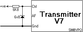 Given that R1 is connected directly to the battery supply voltage, if the battery voltage were to vary then so would the TX frequency. You should really be using a stabilised power supply, or a high-current battery that has a fairly constant supply voltage. If this is NOT the case then you can use the CTRL terminal to bypass R1, without making any modifications to the TX. All we need is an external zener diode and a 6K8 resistor. The Zener diode should be as high as possible. If you have a 12.5v supply, for example, then a 10v diode would be great. With a 9v battery then a 6v8 diode is about the maximum practical. 8v2 would be Ok until the battery voltage went down a bit. We will asume that +VE is a 9v battery.