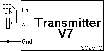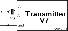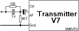 If you are using DC modulation then the AF input will allow this. This can be used to give low frequency Frequency Shift Keying. This should only be done in conjunction with the voltage regulator above. If you are NOT wanting to have a DC shift, and your input source has a "DC Continuity" (resistance) then there is problem. If you were to connect a magnetic microphone or CD player, for example, to the AF input then the TX frequency would jump. You therefore need to add a capacitor to block the DC shift at the input. 10uF will do nicely. A 4K7 resistor should also be added to give a load to the audio source and to help prevent "hum" or "pickup" from 50Hz (60Hz) wiring. The value of the resistor should be selected to match the audio source impedance of the device. 4K7 is normal for computer and CD LINE-OUT signals.