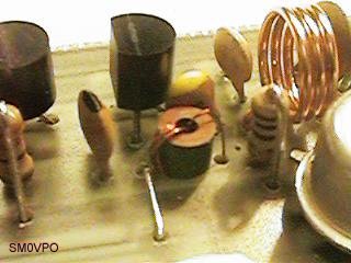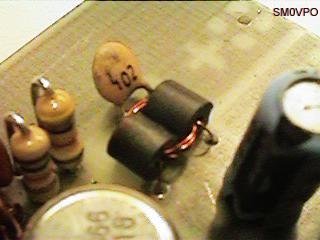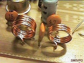 L6 is 3 turns of 0.8mm Dia. enamelled copper wire with a 6mm inside diameter. Just as L3 and L5 the coil is also close-wound. Form the ends of the coil, bending them out then down so that the leads are 5mm apart. You can get a closer view of L5 and L6 in this picture. The position of the capacitor between them is very important, equal distance from both coils keeps the 2nd harmonic at the lowest level.