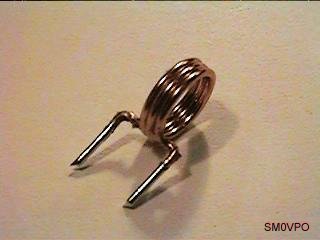 L3 is wound using 3 turns of 0.8mm Dia enamelled copper wire with a 6mm inside diameter. Wind it on a drill bit to get the inside diameter correct. The coil is close-wound, that is to say that the turns are just about touching and shall not be spaced. Form the ends of the coil, bending them out then down so that the leads are 5mm apart. The coil should look like this: