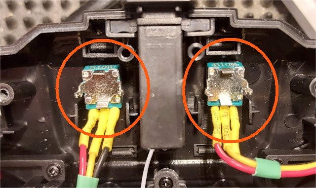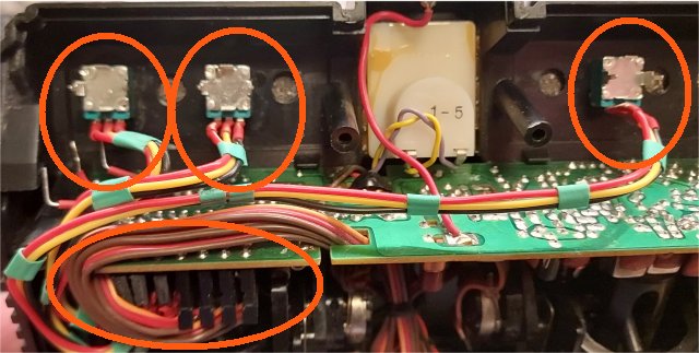 Connecting a 10KΩ potentiometer to the contacts for CH5 to CH10 works immediately. No modifications at all. As you can see I just soldered six 3-pin connectors to the back of the board, so I do not even need to remove the board from the case. To the six connectors I plugged in my six potentiometers. As you can see from the picture above, I didn't have the "special" connectors for additional joysticks, so I used six 3-pole 90° 0.1" headers on the back of the board. There are several advantages to this method, but the main one is accessibility. You can simply reverse a connector to reverse the joystick potentiometer direction, swap or add more channels, without ripping the board out of the unit and risking damage.