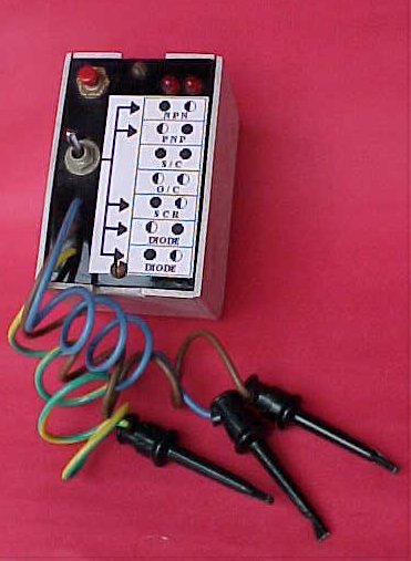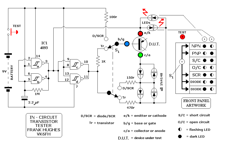 Suffice to say that I have constructed this design and it has provided good results with both small signal and power type transistors, SCRs and diodes of various ratings. From the picture shown and the schematic, a simple front panel graphic is provided this indicates what all the flashing and unlit LEDs actually mean! I have used E-Z type hooks to connect the device to be tested. Supply is a 9v miniature battery.