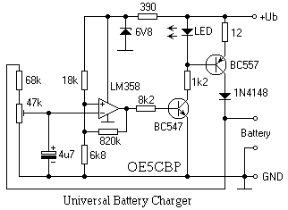 This is a charger circuit for both NiCd and NiMh Batteries. Some time ago I aquired an old commercial handheld-TRX which was powered by a 12 Volt NiCd-Battery pack (10 Button Cells each having a capacity of 280mAh). In fact this (at least 10 year) old battery is best because there is a very special charger used: When the Battery voltage is low it is charged with the usual constant current source in the normal way. But when the battery voltage increases, the charging current will become pulsed. A completly fully charged battery only requires short flashes to maintain its charge and terminal voltage. Here is the circuit diagram: