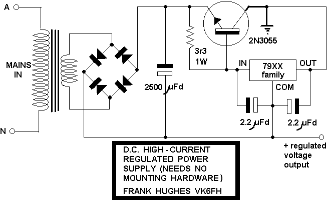 The circuit shown above is for a positive regulated DC supply that uses commonly available components. It is a variation of a well known design, but differs in the fact that it uses a negative three-terminal regulator (79xx etc) and a 2N3055 NPN 'pass' transistor which is directly chassis mounted. This provides a heatsink, and establishes the ground point of the circuit through the Collector's metal case mounting point. The advantage being of course; no insulating mounting hardware for the 2N3055 is required. It should be noted that this arrangement precludes an incoming (unregulated) voltage that has the negative side tied to chassis ground (standard practice) - i.e. a floating input is needed. Minimal current flows through the 3-terminal regulator, so this need not be heatsinked. Because of its simplicity, there is no real over-current protection, so any short circuits on the output would be best avoided! Use a 3-term regulator from the 79xx family, available 5, 8, 12, 15, 24 volt etc, the incoming DC supply voltage should be 20% - 50% higher than the regulated dc output voltage, for efficient operation and ensuring that there will be sufficient current available to supply the load.