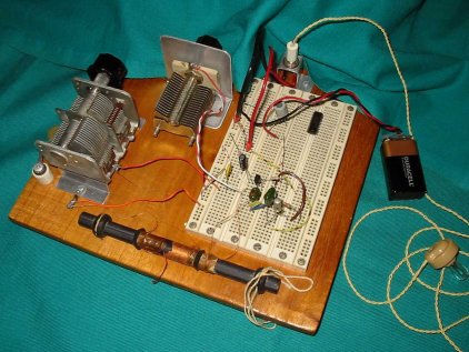 I can happily give details on the coils to people interested under request ( I use a black plastic 35 mm film container and #20 AWG enamelled wire ). Finally, I'm using a solderless breadboard for the connections between components ( a practice not recommended for RF by purists, but it worked in my case ).
