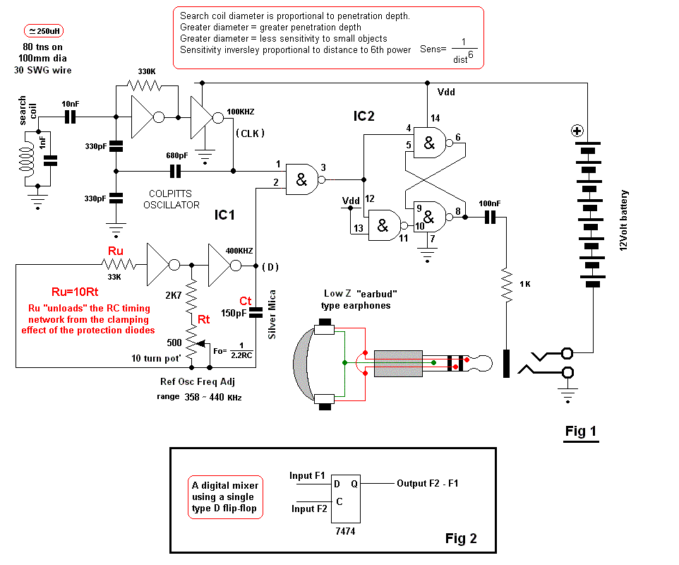 IC1 uses inverters connected as a Colpitts oscillator of 100KHz; the LC frequency determining elements being the search coil and parallel resonating capacitor.