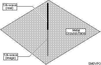 As you can see, you can see a reflection of the antenna in the tin-plate, and the reflection is pointing down. We can see in this mirror surface a half-wave antenna although half of it is missing. A signal radiated from the antenna will also be reflected in exactly the same way. In other words, instead of using a 1/2-wave antenna we can push our luck and do-away with half of the antenna completely. The metal ground-plane could be any old lump of metal, as long as it is big enough. It could even be the Earth itself, as it is commonly used at HF. This type of antenna is known as a Ground Plane antenna. It is not as efficient as a 1/2-wave antenna since the groundplane is only acting as a big sponge for the other half of the current that is not going up the antenna.