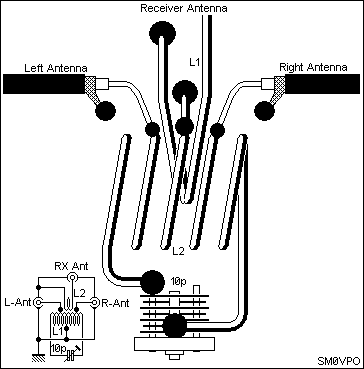 The two antennas are each fed into a tuned circuit via UR67 (B) cut to 0.66 x 1/2-wavelength. The centre-tap of the tuned circuit is grounded and each antenna is coupled to + and - one turn. This effectively cancels out the received signal only when the two incomming signals are in phase. The two signals are only in phase when the two antennas are equal distance from the target transmitter; the T mount is at right-angles to the direction to the transmitter. The tuned circuit is tuned for the part of the band you are interested in.