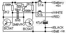 The RC-servo is driven from a control unit in the shack using the above circuit which generates a 1 mS pulse that can be varied from 0.5mS to 1.5mS to give the reqired servo rotation. S1a cuts off the supply to the oscillator and the servo, and S2b cuts off the pulses to the servo. The 47uF decoupling capacitor is necessary, but it must be wired accross the battery otherwise it will store sufficient charge to give the servo a 'kick' on switch OFF which detunes the antenna.