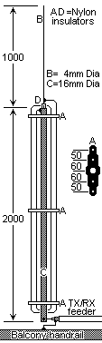 The insulators at A are cut from a nylon chopping-up board (stolen from the kitchen) and the aluminium pole C is 16mm Dia aluminium tubing, 2 meters or so long. In my experiments I found that the TOTAL length of wire + pole + top-section should be about one meter LONGER than a calculated 1/4 wave but the wire may be "pruned", & the lower "A" spacer moved up the pole a little to compensate.