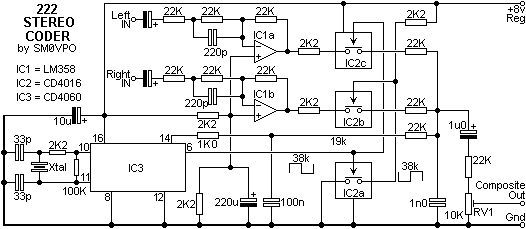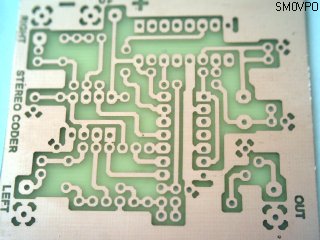 The prototype is built on a single-sided PCB. If the input buffer OpAmps are not to be fitted, then simply do not fit IC1, but add a link between pins 1 and 2, and another link between pins 6 and 7. This will then require a good 3v peak-to-peak drive level, but is ideal when driven from a stereo amplifier, sony walkman or MP3 player. As given the circuit adds the 19kHz pilot tone at about 10% (-20dBmo), and this level is set by the two 2K2 resistors between the OpAmps and the bilateral switch inputs. If these resistors were increased in value, then the circuit will tolerate higher input AF levels, but as given it needs about 1v peak-to-peak, which matches almost all equipment with "LINE OUT".