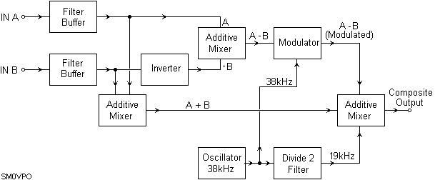 The two stereo channels (A and B channels) are each passed through a buffer amplifier, where any filtering and pre-emphasis is added. Both of these are passed to an additive mixer to form the A+B signal. The B channel is inverted and passed to the second additive mixer, together with the non-inverted A channel, to give the A-B signal.