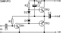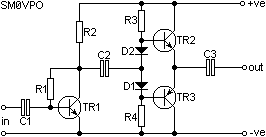 This circuit will work fine and give quite good results. It is, however, a little wastefull with components. In Biasing transistors - 1 we saw that the collector of TR1 should be set to 50% of the supply voltage by adjusting the value of R1. We also saw that D1 and D2 should be set around 50% of the supply voltage (+/- 0.7v); in other words, they should be the same voltage. So why not allow R1 and TR1 to set the operating conditions for TR2 and TR3? In this way we can save two resistors and a capacitor.