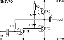 Now that looks a lot simpler. The most important point that we want to have 50% of the supply voltage at the junction of the emitters of TR2 and TR3. So I have taken the liberty of returning R1 to that point. The function of D1 and D2 is exactly the same as before, but this time they are driven by the current through TR1 and R2.
