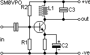 For radio frequencies we need to feed some signal back to the input, but instead relying an a phase-shift being right at only one frequency, we will use a tuned circuit. Begin with a basic RF amplifier again. L1/C3 determine the frequency it will amplify.