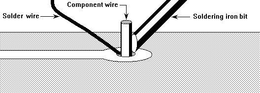 Before applying the solder to the joint, wipe the tip on a slightly moist sponge to remove oxides and excess solder. Apply a very small amount of solder to the tip of the iron so that there is a very thin film of solder on the bit. Apply the soldering iron to the joint so that it touches both the component lead and the PCB solder pad. Apply the solder wire to the component lead and NOT to the iron. When the joint has heated sufficiently the solder will flow over the joint. Remove the solder and iron simultaneously and leave the joint to cool naturally. Do not blow the joint to cool it or try to move it until the solder has become solid or a poor joint will result.