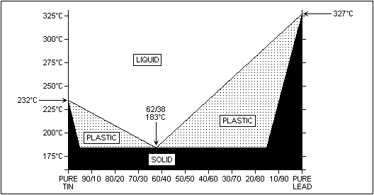 The graph above shows why the temperature of the soldering iron is most important, and why we use 60/40 solder. I usually run my soldering iron at about 220 - 280°C which is ideal for delicate printed circuit boards. SRPB is easily damaged, so under 250°C is a requirement for delicate tracks. Higher temperatures will destroy the glue under the copper, so wide tracks should be soldered as quickly as possible if the iron must be run over 250°C. Many fibre-glass will tolerate up to about 360°C, but this sort of temperature should be regarded as a killer for all PCBs as it is ridiculously high. You should never exceed 300°C, except when you are soldering mechanical items, such as copper heat sinks. By the way, if you have one of these new soldering iron thermometers, then don't take the temperature reading for granted!