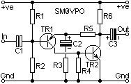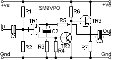 This circuit is identical to the two transistor circuit above, but the output is buffered. This circuit is quite capable of driving lower impedance loads, such as "walkman" (freestyle) stereo headphones (or antennas?). R7 is typically 270R and C3 would be as much as 470uf or more. All other components are the same as the two transistor circuit.