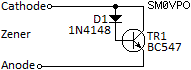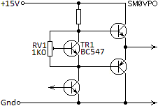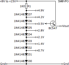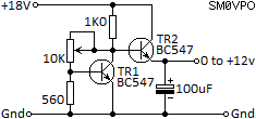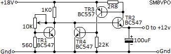 TR1 is the variable diode and TR2 is the current buffer. You do not need a D0 to push the voltage up by 0.7V because the variable zener has a voltage range from 0.7V to 12.7V with the values I have given. The oputput of the regulator is therefore 0V to 12V. Here is the same circuit but with current limiting added.