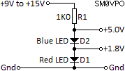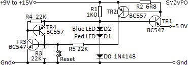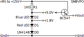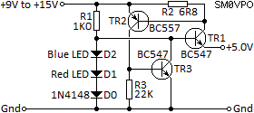 Once more the addition of just one transistor current-buffer transistor can give you up to 100mA, and the addition of a 1N4148 (D0) will give you 5.7V at the diode to deliver a regulated 5.0V out of the regulator. One of the LEDs can be fitted to the front panel of your PSU to act as a power indicator; a dual function.