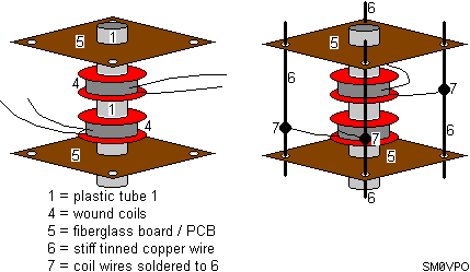 When the coils have been assembled, as above, fit stout tinned copper wires between the corner holes. If you used copper-clad board then it should have been etched so that pads are available for soldering. Otherwise, just glue them using Areldite, or any other epoxy.