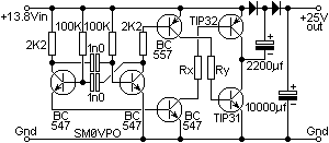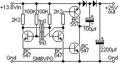 This is a basic circuit that oscillates at about 10KHz and drives a pair of complementary transistors hard into conduction. This is then rectified and added to the original +13.8vDC to give about +25 volts DC out. It will provide up to 100mA at 25v with the components shown. In effect the circuit is a DC supply doubler. It is quite efficient since the output of the power oscillator is a square-wave (the RMS value of a square-wave is equal to its peak value).
