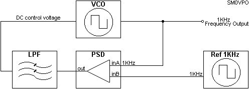 Here we have a 1KHz reference oscillator feeding the PSD Input-B, and a VCO feeding the PSD Input-A. The output of the PSD can be a square-wave and the difference between the positive pulse and the negative is averaged by the low-pass filter (LPF). This filtering results in a DC voltage that is fed back to the VCO to increase or decrease the frequency, as required.