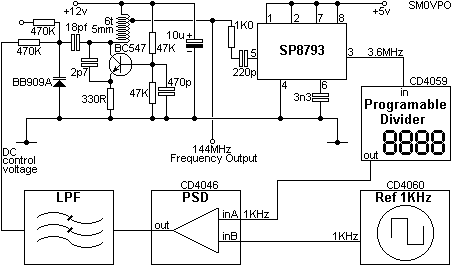 A PRECALER is a logic device to pre-divide a VHF VCO so that simple CMOS chips can be used to process the synthesizer functions. Let us begin with the SP8793 prescaler chip. This is an 8-pin device, just the same as an Operational Amplifier. The SP7893 divides by 40/41 so that a 144MHz VCO would be divided down to just 3.6MHz. This is now well within our tortoise-slow CMOS handling speeds. We take our output directly from the 144MHz VCO, but the CMOS takes it's output from the SP8793 at 3.6MHz, like this: