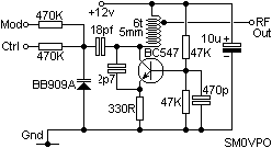 Notice how there are two inputs to feed a DC voltage to the Varicap Diode. One input would be used for the PLL control voltage and the other for a modulation input. Since the tuning diode does not draw any current a very high value of series resistor can be used (470K) to feed the DC to the diode. The rest of the oscillator is a very simple and unremarkable VHF oscillator. Those of you who have played around with my FM Wireless Microphone will no-doubt recognise the circuit. The 12pf tuning capacitor has been replaced with the tuning diode. All diodes have a variable capacitance when reverse biased and these can be pressed into service if Varicap diodes are unavailable (or too damn expensive, as they are here in Sweden). Here are a few examples of diodes that can be used:
