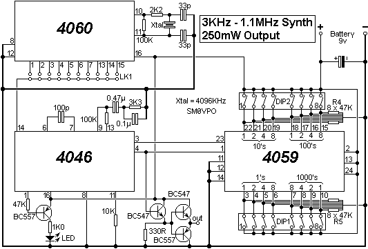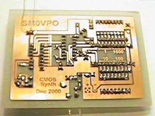 I have included on the PCB thermal breaks around all component leads soldered to large lands of copper. As you can see, the only DIP switches on the board are the frequency selection switches. The reference frequency is fixed at 1KHz and this is derived from a 4096KHz crystal and divided by the CD4060 integrated circuit divider. So what is next? You build this interesting synthesizer for yourself, that´s what! I shall shortly post the VHF VCO/Prescaler board so you can add to the project. The VHF VCO board uses coils fabricated on PCB, but there are several PCB coils for different bands. But, you will just have to wait for the project. Just bookmark Harry´s Homebrew Homepages and come back regularly.