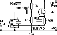As you can see, there is nothing particularly clever about the oscillator. It has become one of my most recent standard building blocks and uses a coil etched on the PCB. The transistor can be anything that functions at these sort of frequencies, BSX19 works well, but I have thousands of BC547s in stock and they work well. The coil should be tapped at about 10% to 20% for the emitter of the oscillator transistor. Tapped at about 5% to 10% for the output. Output is about 1mW. I will be posting the PCB foil pattern, but like all things these days, it takes time.