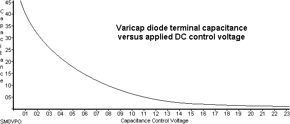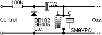If the DC bias (control voltage) is higher then the peak RF waveform then the diode will always be reverse-biased. The diode then acts as a normal "varicap" (Variable Capacitance) diode. This method can give up to a 2:1 frequency ratio (eg. 75MHz to 150MHz). 2C is typically twice the value of the tuning capacitor maximum. If you make it any largerthen it will damp the oscillator and stop it from oscillating before reaching the lower frequencies.