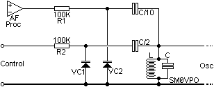 Here we have two varicaps. R2 and VC1 are the usual control voltage from the synthesiser's loop filter, but R1 and VC2 are added for modulation. The diode VC2 is biased at a fixed point, in this case by the output of the AF amplifier that does not have a DC blocking capacitor. VC2 will therefore always be operated at the same point in it's caracteristic and will give a reasonably constant capacitance change under all conditions. Note that since modulation frequency variations are a lot smaller than the control voltage frequency variations, the capacitor C/10 is typically only 10% of the tuning capacitor, probably even a lot less than this. C/10 should therefore be a high tolerance type.