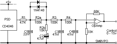 The Op-Amp at the end in the previous circuit is just a voltage level converter. My varicap diode needs 1v to 15 volts to give a decent control range, but the CMOS/TTL circuit will only give me 0v - 5v. This little circuit will do the job quite nicely.