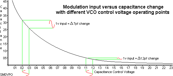 When the control voltage is low then small voltages give a large capacitance change (high deviation level), but if the control voltage is high then the deviation will fall off dramatically. A modulation change of 10:1 is typical, so it would not be possible to predict the modulation depth at any given control voltage setting. What we need is a diode operated at a fixed point in it's characteristic curve, so we need yet another varicap diode.
