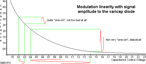 Another problem with a simple varicap modulator is that the capacitance is not linear with the voltage. Audio modulation is usually of such a low amplitude that the minute part of the diode's used looks very close to linear, but we also have a control voltage to the same diode. That is what "cocks it all up".